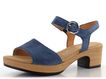 Stylové dámské kožené sandály v modré barvě na vyšší platformě s podpatkem v dřevěném dekoru.